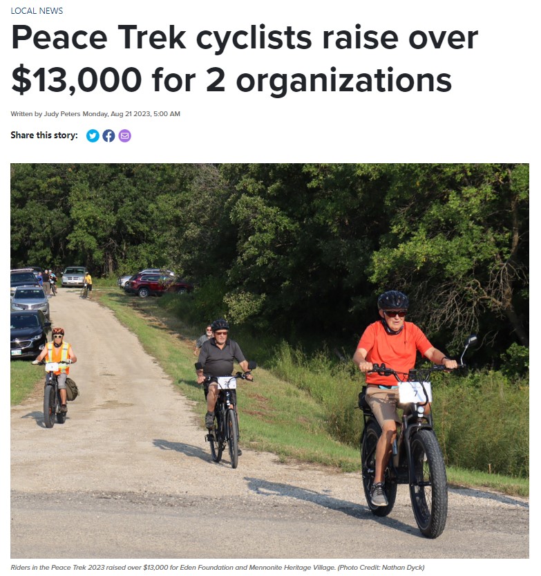 On Saturday, August 19th 2023, Eden Foundation along with the Mennonite Heritage Village hosted the 2nd annual Peace Trek cycling event. 17 cyclists met at the Mennonite Landing Site near Niverville and made their way through the historic Peace Trail, ending up at the Mennonite Heritage Village museum in Steinbach.