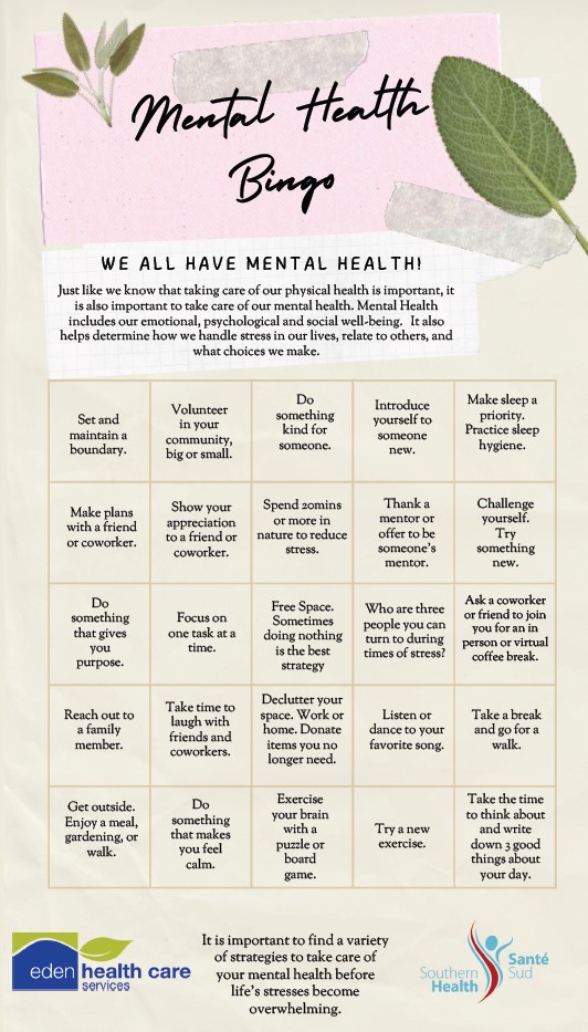 Ready to have some fun while raising awareness about mental health? Join us in playing Mental Health Bingo! It’s a great way to learn about different aspects of mental well-being while connecting with others. Check out our bingo card and let’s start the conversation about mental health together!